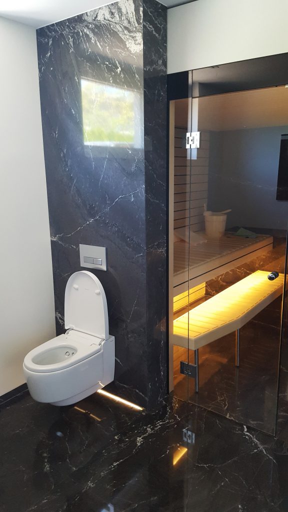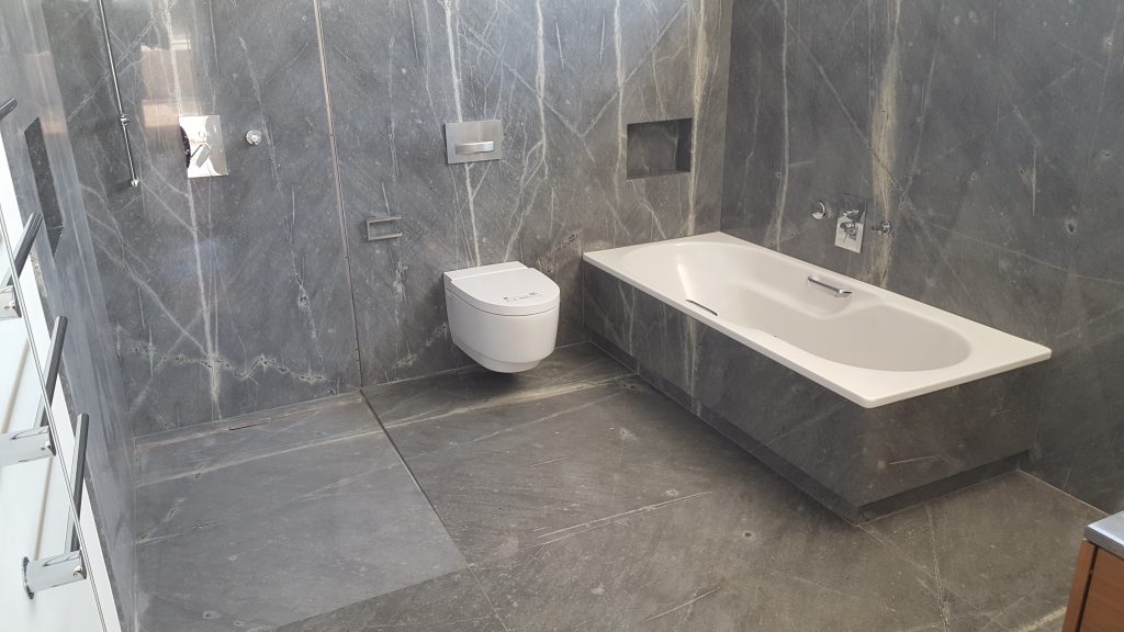 - Travertin ist ein weiterer Naturstein, der häufig in Badezimmern verwendet wird. Seine warme Farbgebung und die poröse Struktur verleihen dem Raum eine mediterrane Note. Travertin ist widerstandsfähig und pflegeleicht, bedarf jedoch einer regelmässigen Imprägnierung, um seine Langlebigkeit zu gewährleisten.