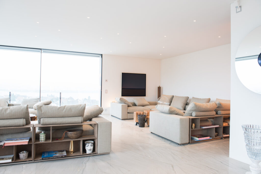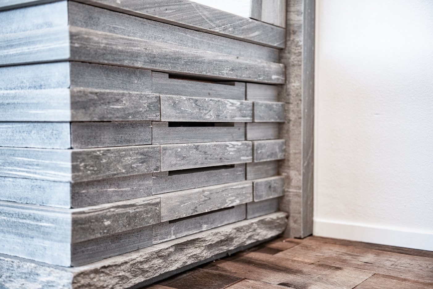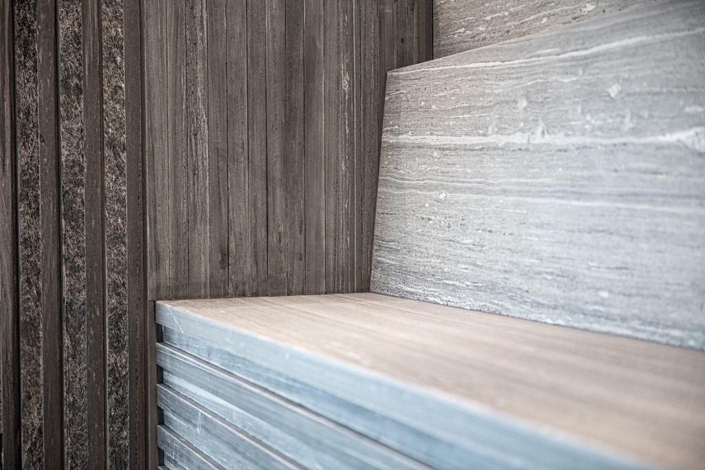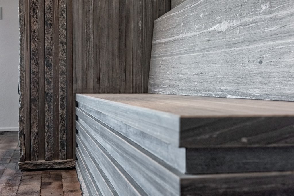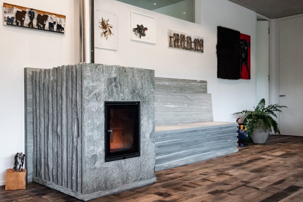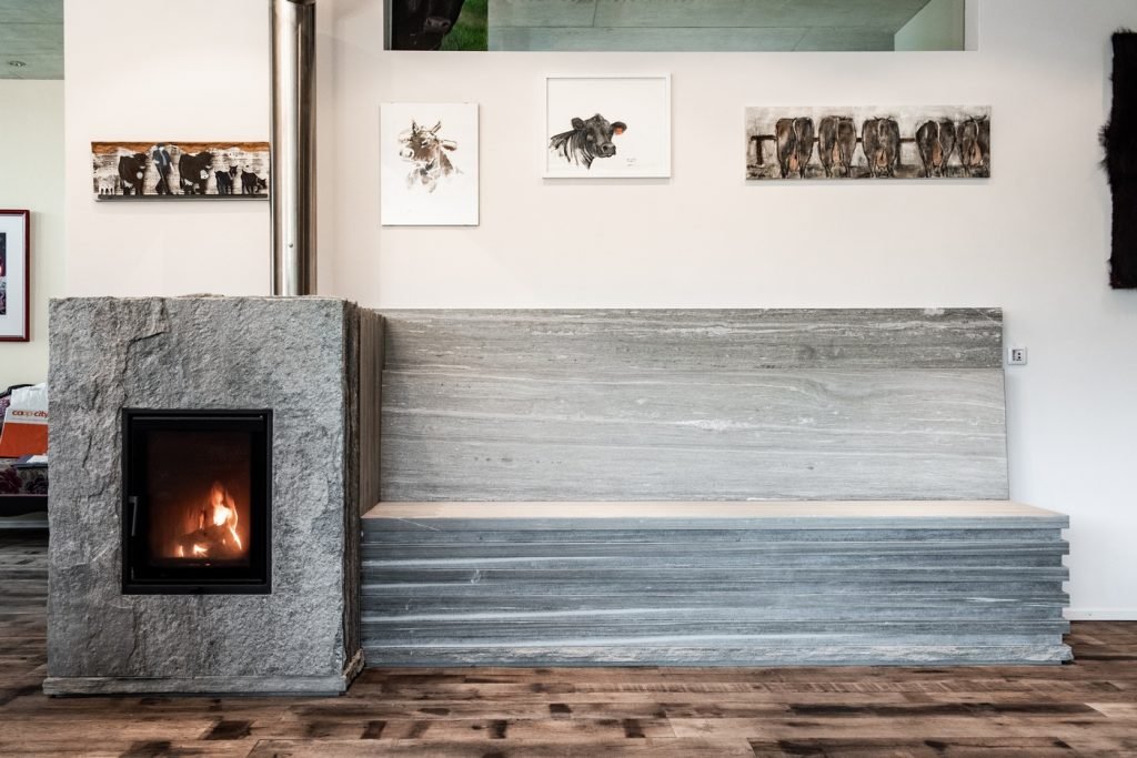 Die gemauerte Unterkonstruktion wurde von einem erfahrenen Ofenbauer erstellt, der nicht nur den funktionalen Anforderungen eines Ofens gerecht wurde, sondern auch die optische Integration in den Wohnraum berücksichtigte. Die angrenzende Sitzbank aus dem gleichen Material sorgt für zusätzliche Behaglichkeit und schafft eine harmonische Verbindung zwischen Ofen und Sitzbereich. Die Bank lädt zum Verweilen ein und wird durch die Verwendung des Valser Quarzits zu einem stilvollen, praktischen Möbelstück, das die Wärme und Atmosphäre des Ofens verstärkt.