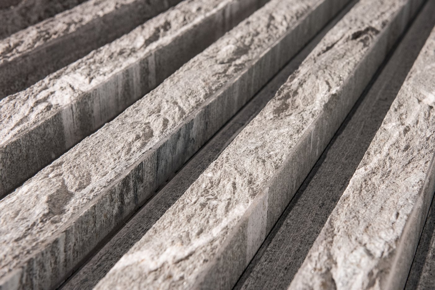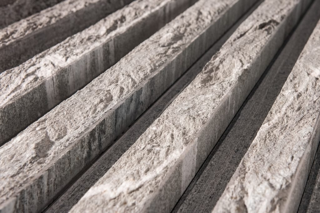 Ein besonderes Merkmal dieses Ofens sind die einzelnen Steinringe, die passgenau von vorne über den Grundkörper des Ofens geschoben wurden. Diese Technik erfordert höchste Präzision und gibt dem Ofen eine markante, ästhetische Struktur. Die raue Optik der gebrochenen Kanten harmoniert perfekt mit der glatten Oberfläche des geschliffenen Quarzits und verleiht dem Design eine zeitlose Eleganz.